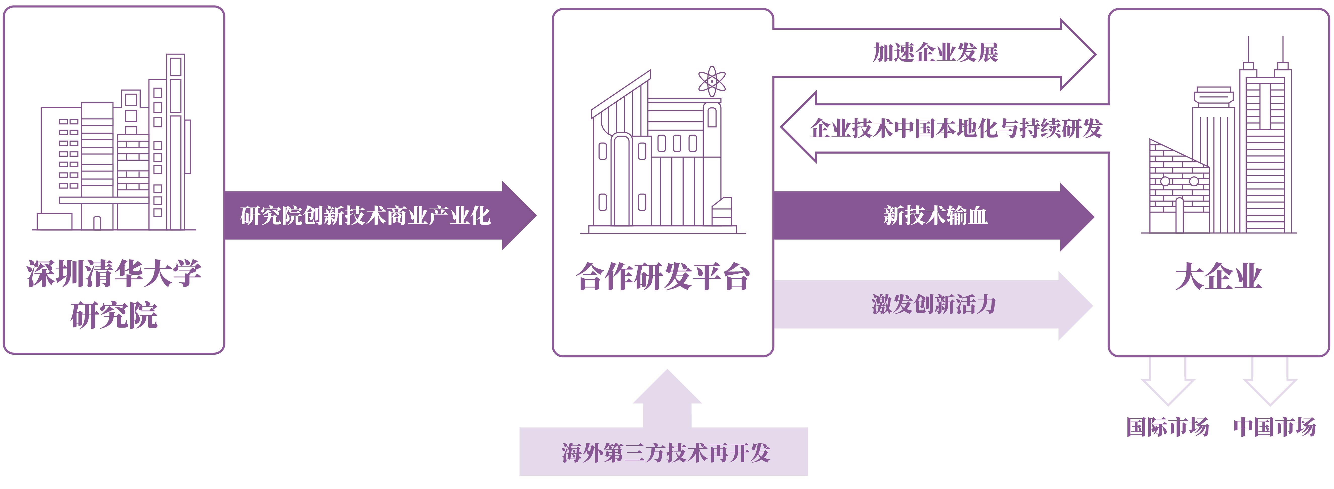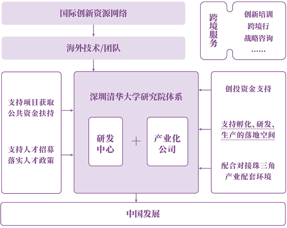 自2011年以来,依托自主搭建的广泛海外创新资源网络,以及清华大学和深圳研究院丰富的国内网络资源和完整的科技创新体系,进行国际创新技术交流与跨境孵化加速,面向政府、科研机构和企业提供国际资源对接、技术转移咨询等专业服务。海外合作团队拥兼具专业化和国际化,海外中心主任均具有工科背景和所在国多年学习工作经历,拥有丰富的技术和商业资源,熟悉掌握当地商业规则和技术转移运作,对项目具有综合的判断和运作能力;国内支持团队则从研发合作、 投资合作、项目/人才落地服务等层面提供支撑。