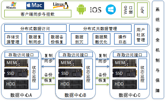 突破了海量存储的可靠性技术,通过内嵌的大规模纠删码存储方式,保证了数据在系统中不会丢失;突破了跨数据中心的超大规模存储空间统一管理技术,在提供用户统一视图的同时,降低了多站点同步的数据传输量;突破了主存储冗余数据删除技术,通过基于位置敏感哈希识别相似数据段和以相似数据段为单元组织删冗元数据等手段,能够在删除冗余数据的过程中保持存储系统性能。基于上述技术,构建了PB级云存储服务平台,物理存储容量超过了1.5PB。