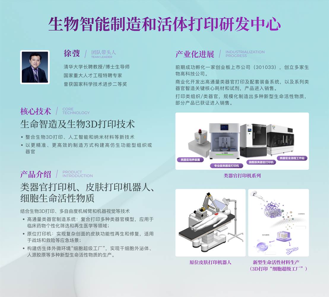 “生物智能制造和活体打印研发中心”于2021年在深圳清华大学研究院成立,致力于更智能、更仿生、更高性能的下一代生物3D打印及前沿医工技术研究及产业化。研发中心团队由“海外高层次人才计划”专家教授领衔、清华大学博士等本领域国内外专家组成。